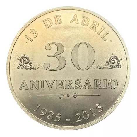 Reverso: En el centro del campo 30 / ANIVERSARIO, con leyenda circular que en su parte superior 13 DE ABRIL y en la inferior: 1985- 2015